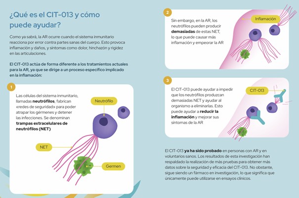 Normalmente, un sistema inmunitario sano protege al organismo contra infecciones, como las causadas por bacterias o virus. Una manera de proteger el cuerpo de tales ataques, es que los neutrófilos (un tipo de glóbulos blancos) producen trampas extracelulares (denominadas NET) para combatir estas infecciones. En la artritis reumatoide (AR) y otras enfermedades inmunitarias se pueden producir demasiadas NET, algo que puede ser perjudicial. El CIT-013 es un nuevo fármaco que puede reducir las NET en el organismo. Esto podría reducir los síntomas de la AR. El CIT-013 es un nuevo tratamiento que funciona de forma diferente a los tratamientos actualmente disponibles para los participantes con AR.